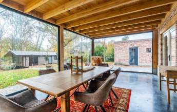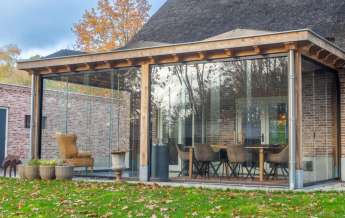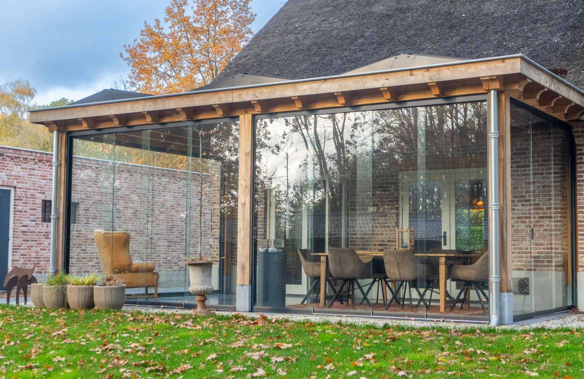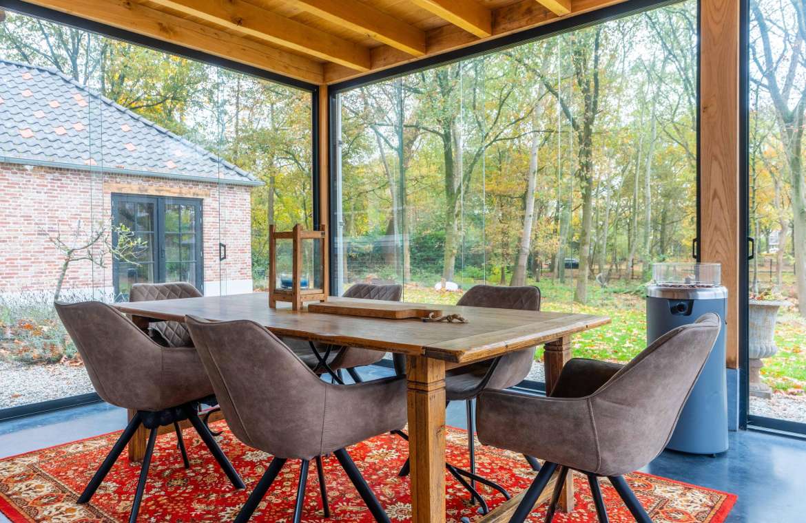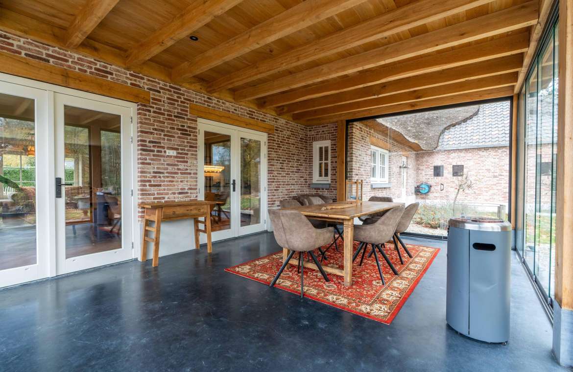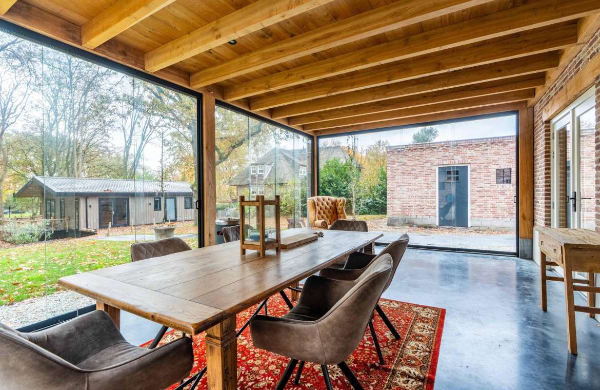 Deze prachtige veranda is ook voorzien van een eikenhouten dakbeschot met balklaag waarop een geïsoleerd dak aanwezig is. Ook is de monolithisch afgewerkte betonvloer geïsoleerd en deze ruime is rondom te sluiten met glazen schuifwanden. Ook hier is TV/internet aansluiting aanwezig.