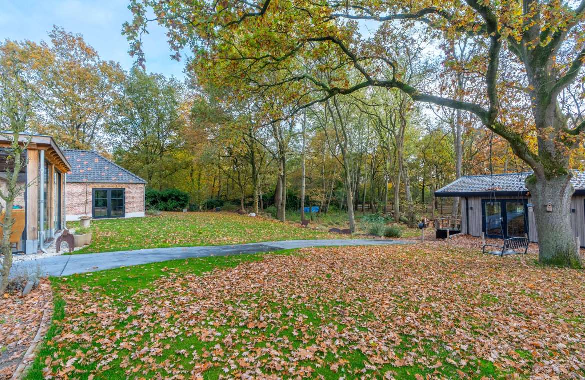 De stijlvolle en onderhoudsvrije aangelegde bostuin heeft een volwassen bomenstand zoals o.a Eiken- Berken en Acasiabomen, verder zijn er nog diverse fruitbomen (peer en appel) en een gazon, siergrind rondom de woningen en een oprit, tuinverlichting en sproei installatie aanwezig. De bediening van de sproei installatie is geplaatst in de garage. De tuin is grotendeels omringd door diverse soorten stuiken en een hekwerk (ook vanuit de fietspad te bereiken middels een looppoort). Het perceel heeft aan de voorzijde aan twee zijden een toegang/ oprit, te sluiten d.m.v. houten (Douglas) poorten.