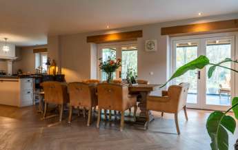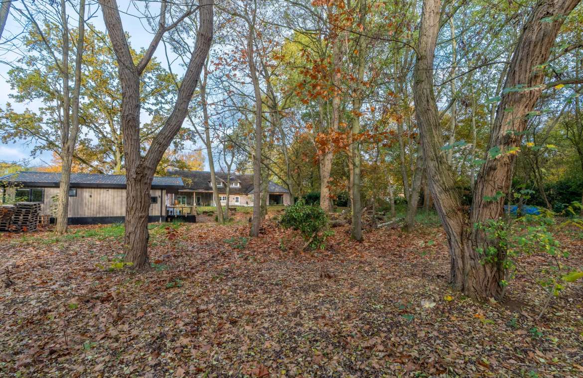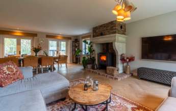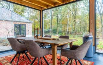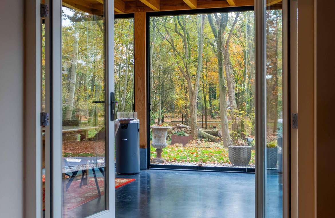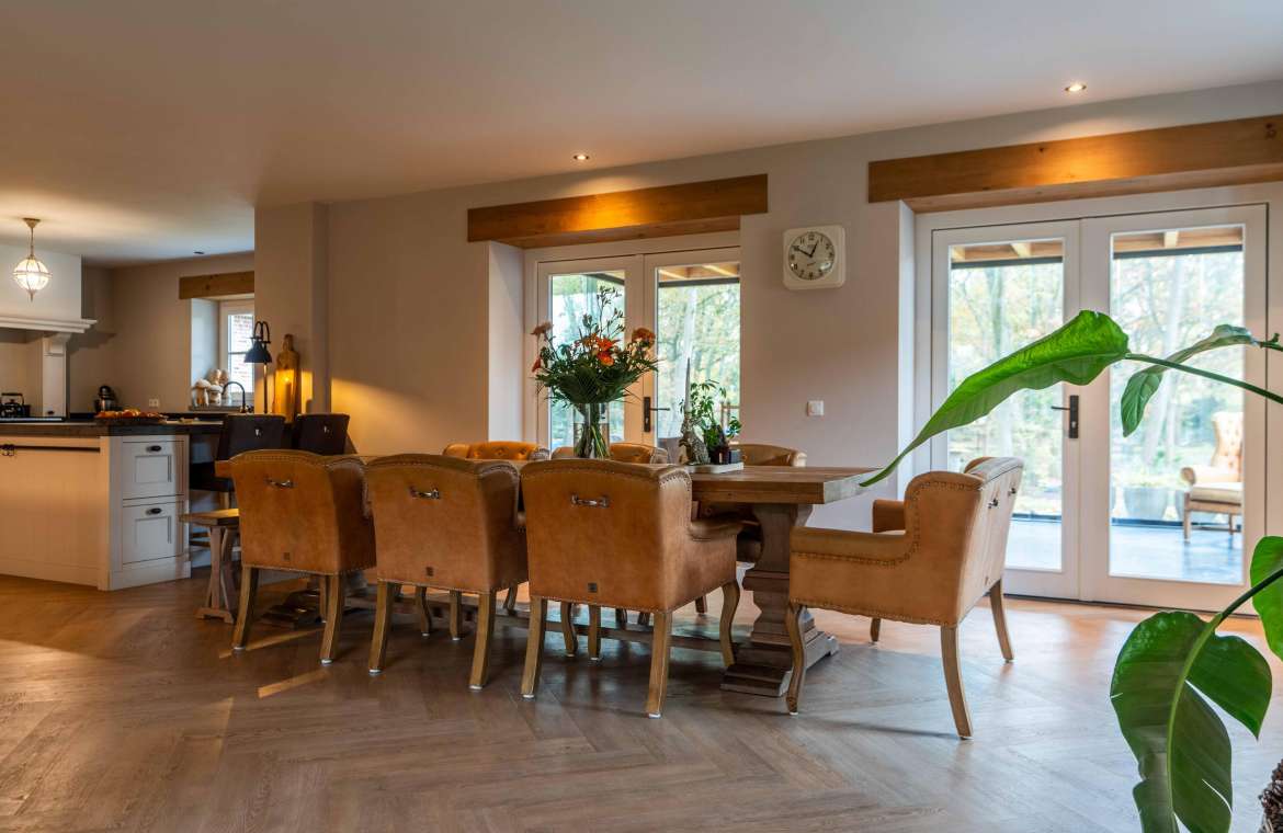 Aansluitend komt u in de heerlijke woonkamer, een fijne plek om te tafelen en gasten te ontvangen! Middels dubbele tuindeuren bereikt u de prachtige tuinkamer welke uitzicht geeft over uw eigen bos..