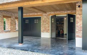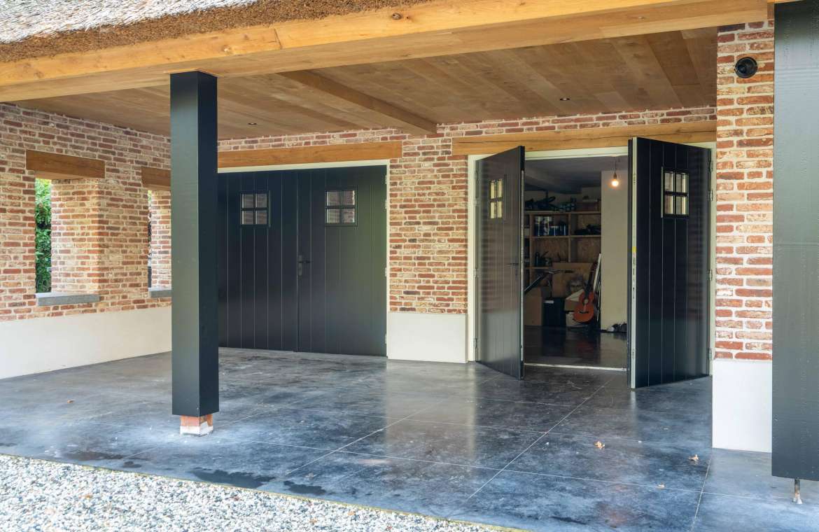 Het plafond/dak van de carport en tuinkamer zijn afgewerkt met een eikenhouten balkenplafond met schoonmetselwerk wanden en een stucplint.