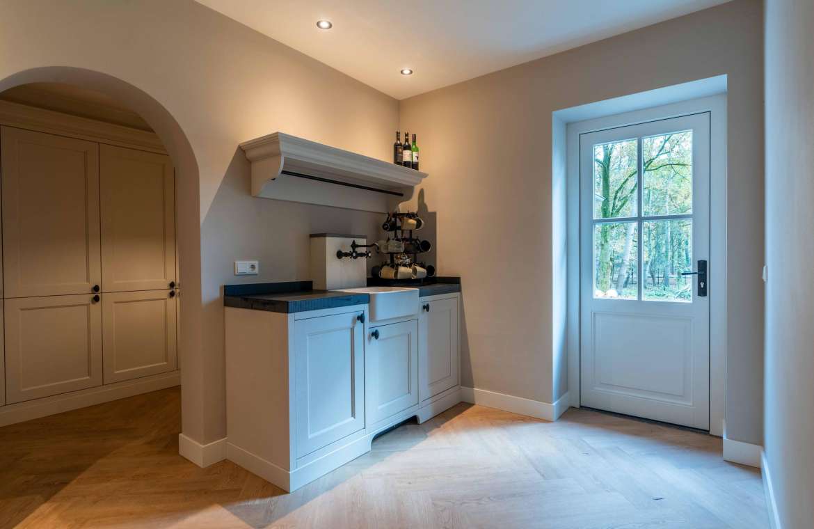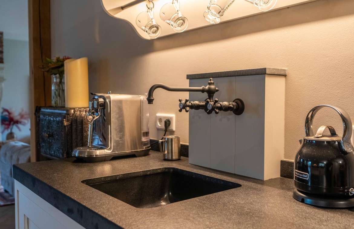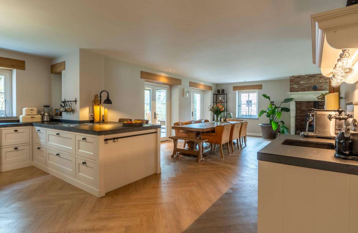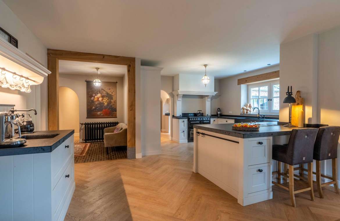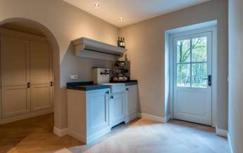 Vanuit de entree komt u in de sfeervolle, luxe en landelijke keuken met koffiecorner. De keuken is van alle gemakken en luxe apparatuur voorzien.
