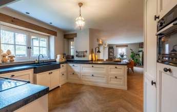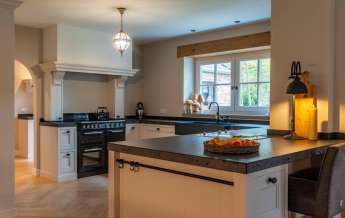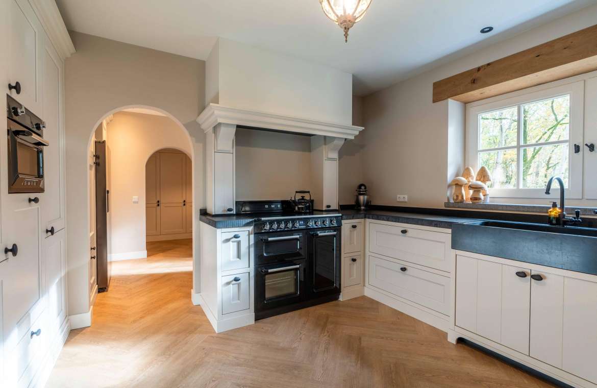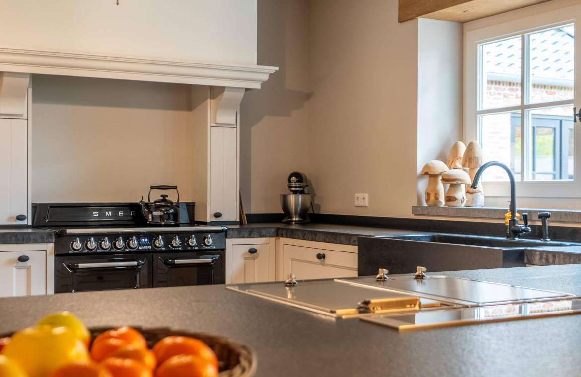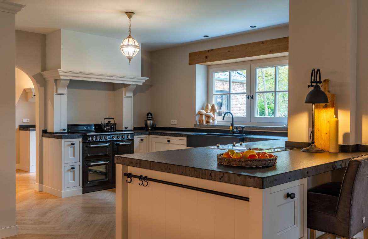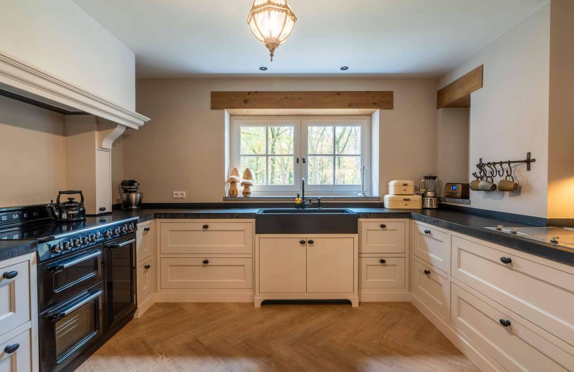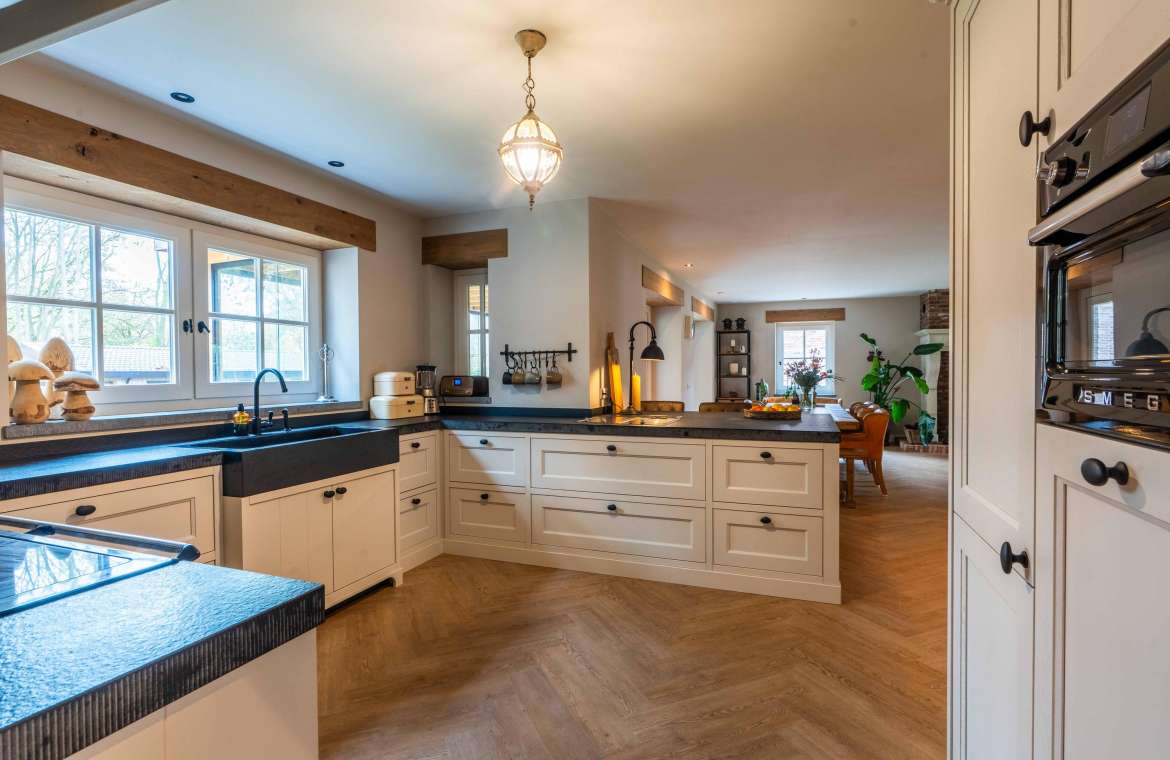 In deze ruime keuken kunt u naar hartenlust kokkerellen, de landelijke keuken is geplaatst in een U-opstelling voorzien van lades en kasten, een basaltstenen spoelbak en een inbouwkastenwand. De keuken is uitgevoerd in een lichte kleur en dat geeft een mooi contrast met het donkere stenen aanrechtblad (met gefrijnde kant).