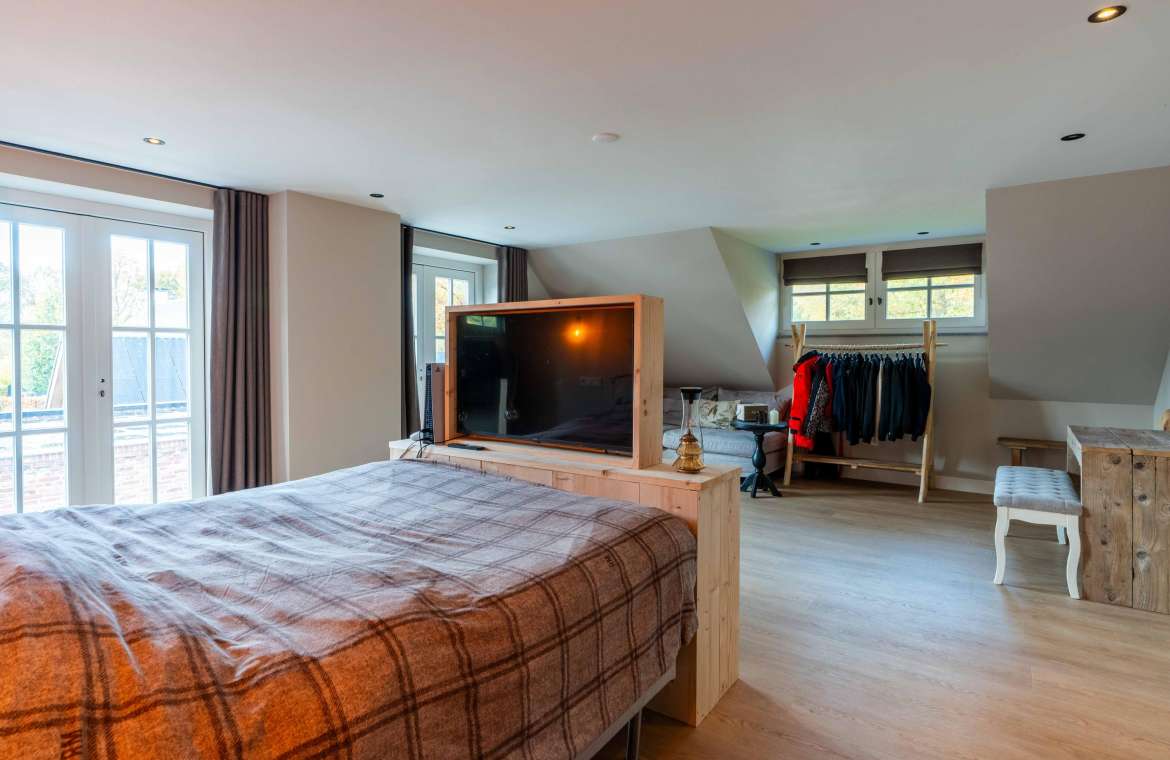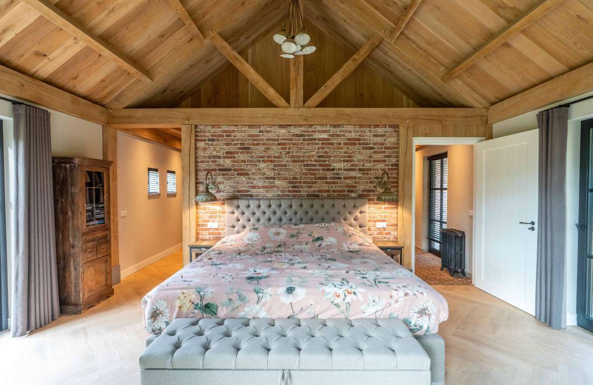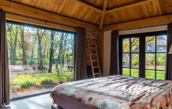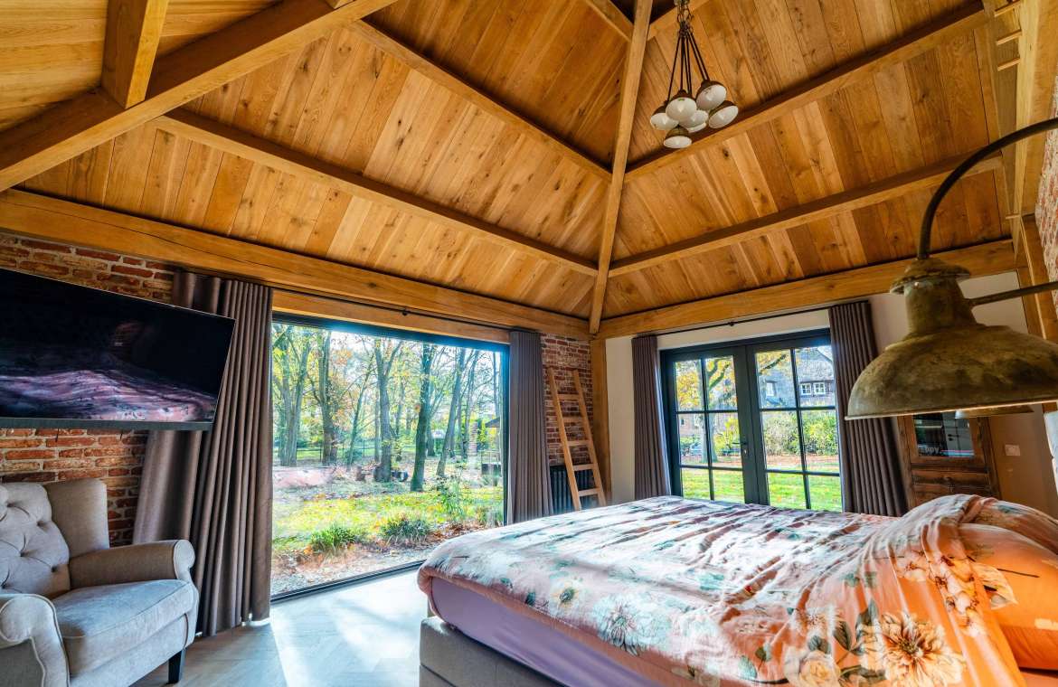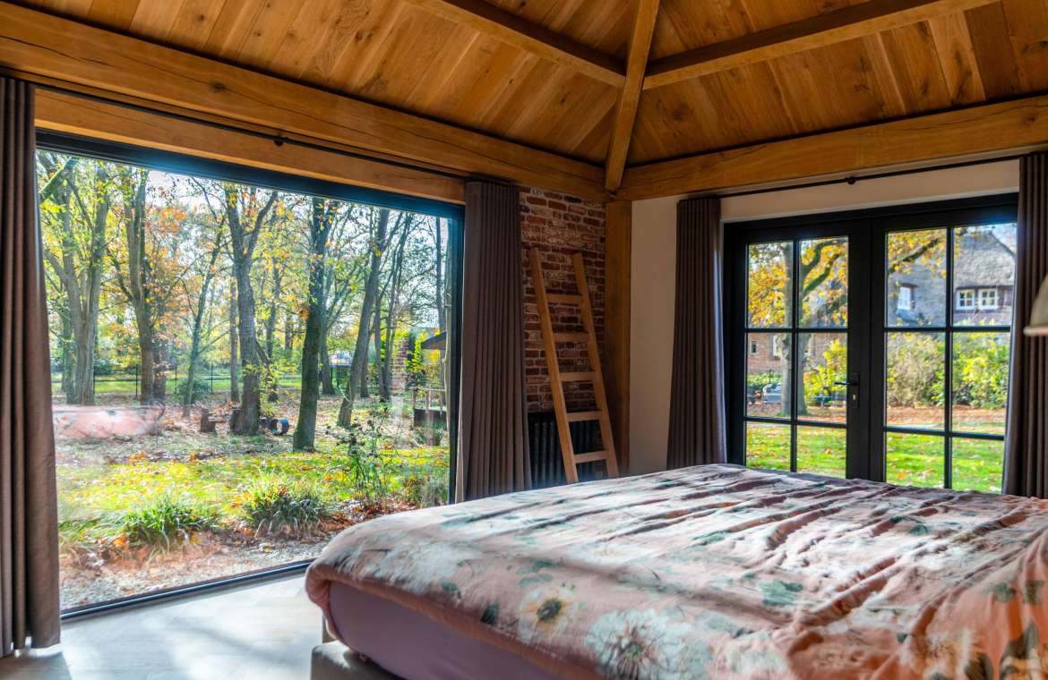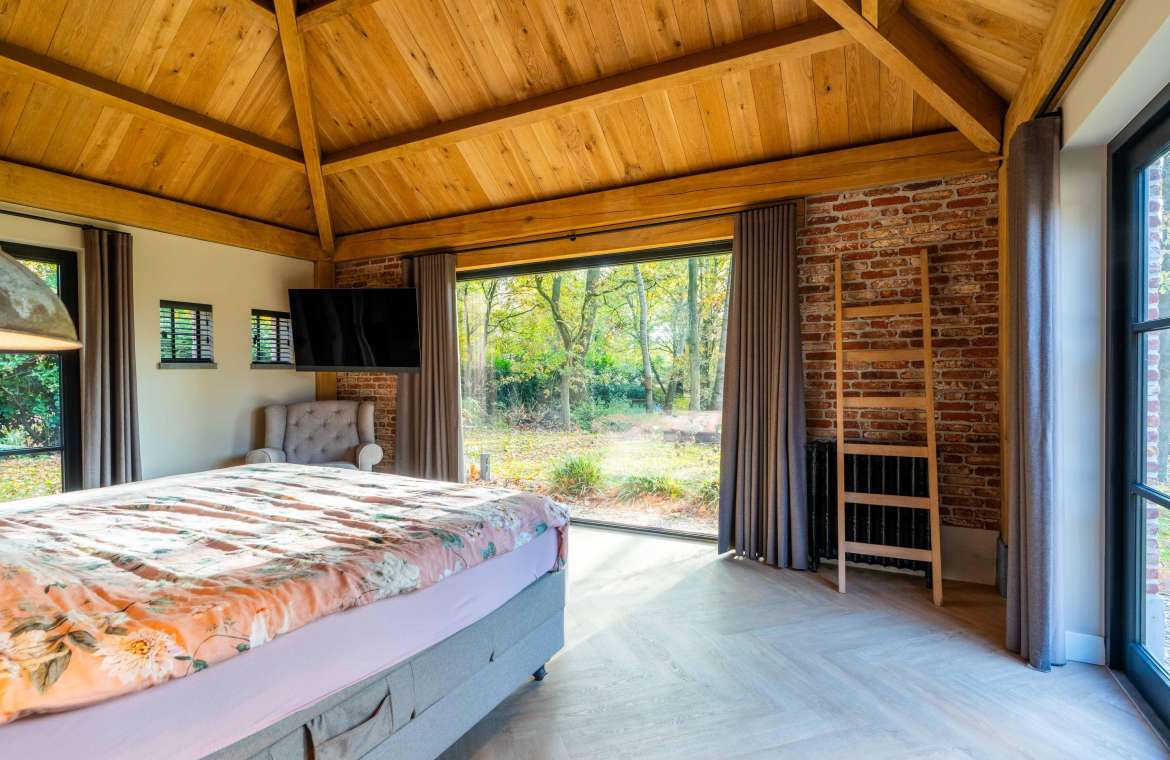 Via de Walk-in closet bereik je deze prachtige slaapkamer. Door de grote raampartijen lijkt deze wel ‘één’ met de tuin. Het hoge dak is tot en met de nok fraai afgewerkt met eikenhouten spanten en betimmeringen. Ook hier kun je middels tuindeuren je bos in lopen.