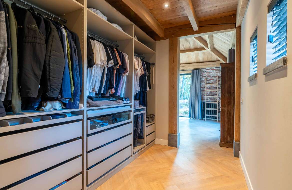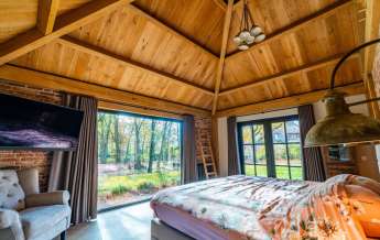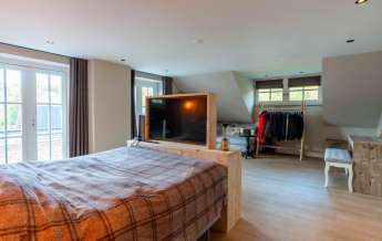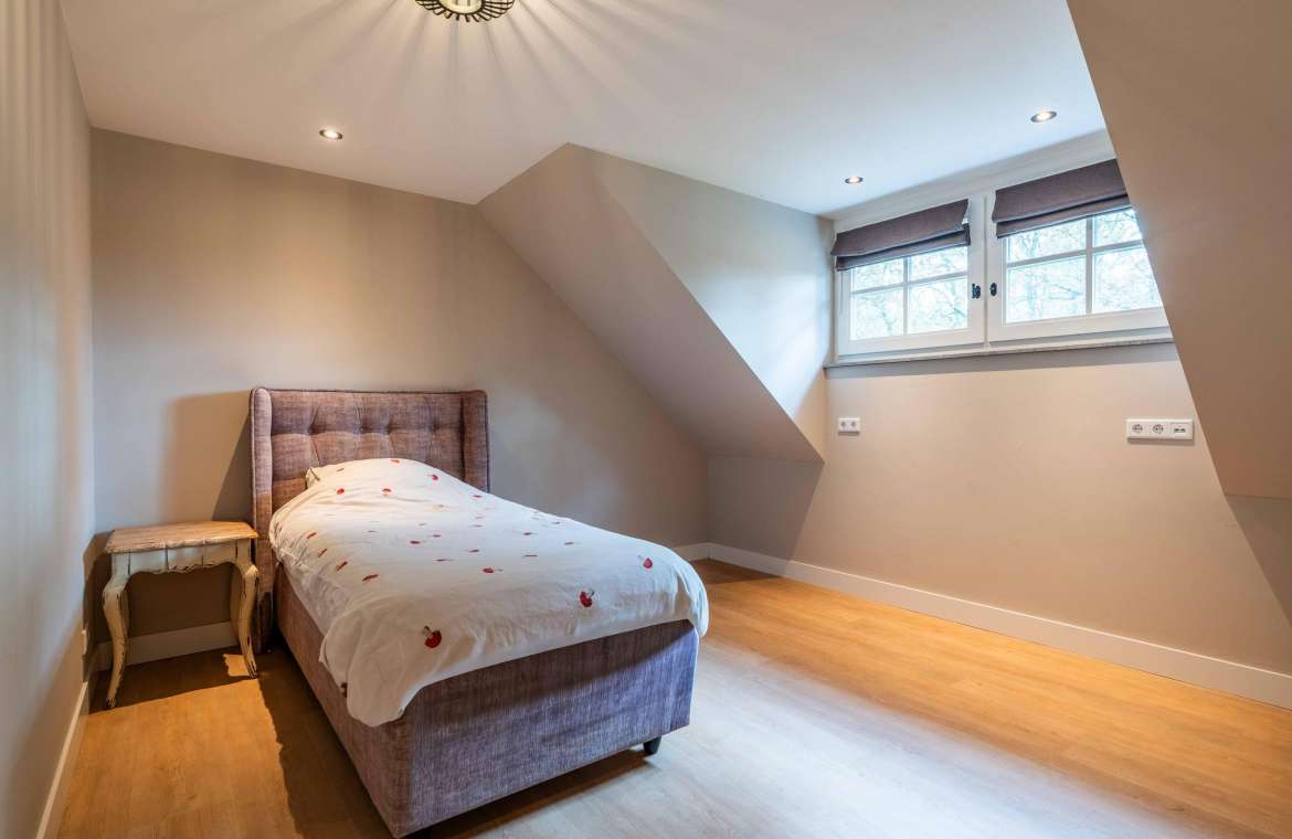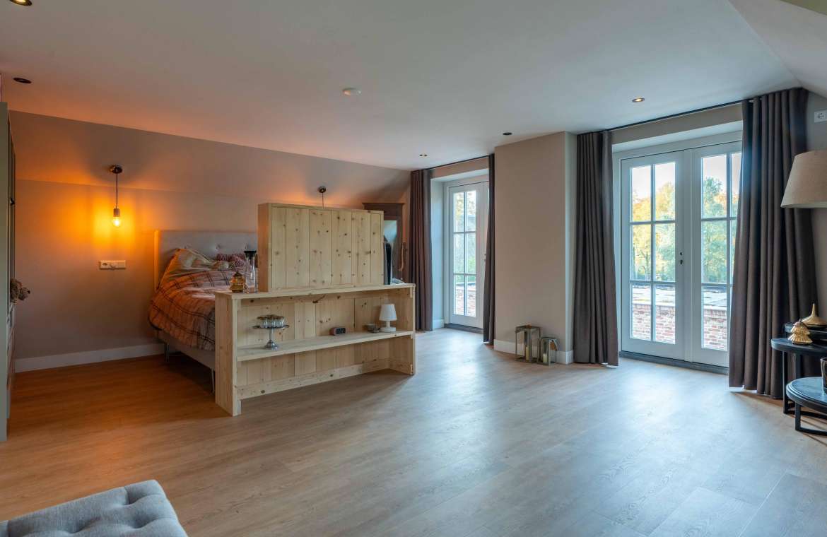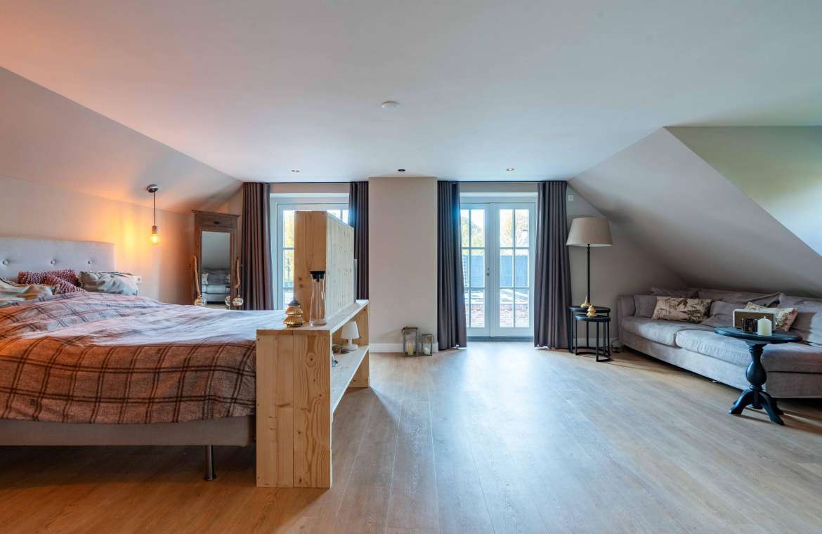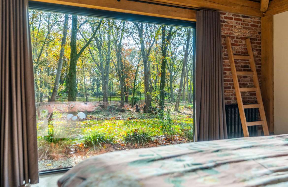 Via de Walk-in closet bereik je deze prachtige slaapkamer. Door de grote raampartijen lijkt deze wel ‘één’ met de tuin. Het hoge dak is tot en met de nok fraai afgewerkt met eikenhouten spanten en betimmeringen. Ook hier kun je middels tuindeuren je bos in lopen.