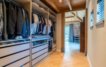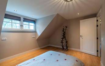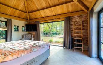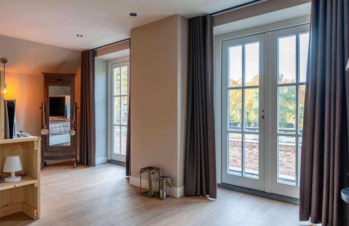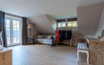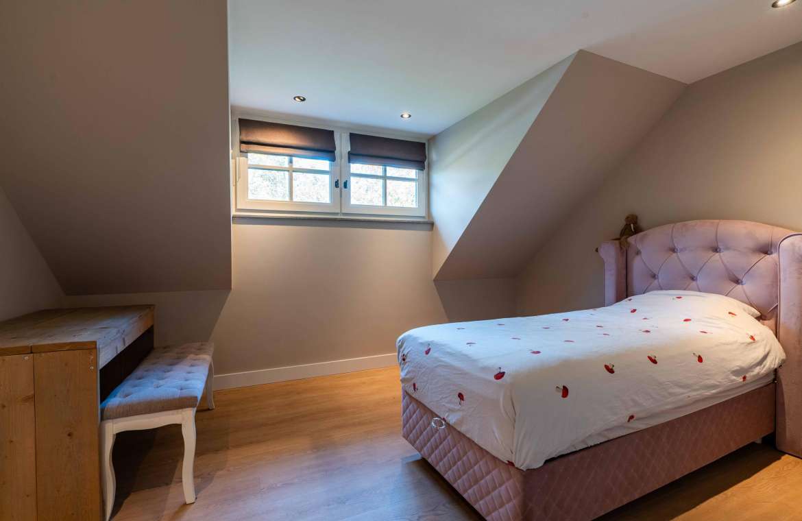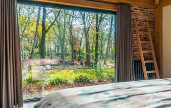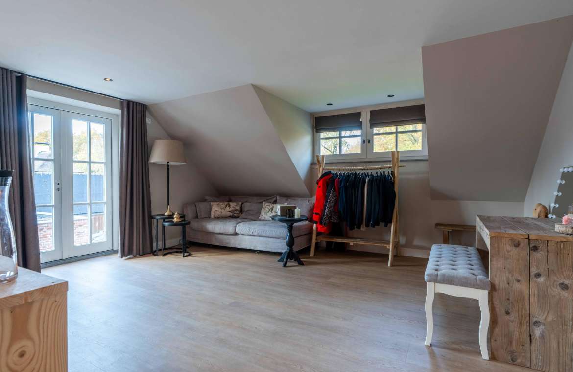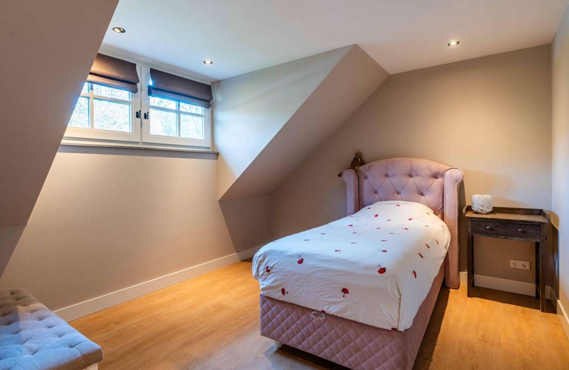 Via de Walk-in closet bereik je deze prachtige slaapkamer. Door de grote raampartijen lijkt deze wel ‘één’ met de tuin. Het hoge dak is tot en met de nok fraai afgewerkt met eikenhouten spanten en betimmeringen. Ook hier kun je middels tuindeuren je bos in lopen.