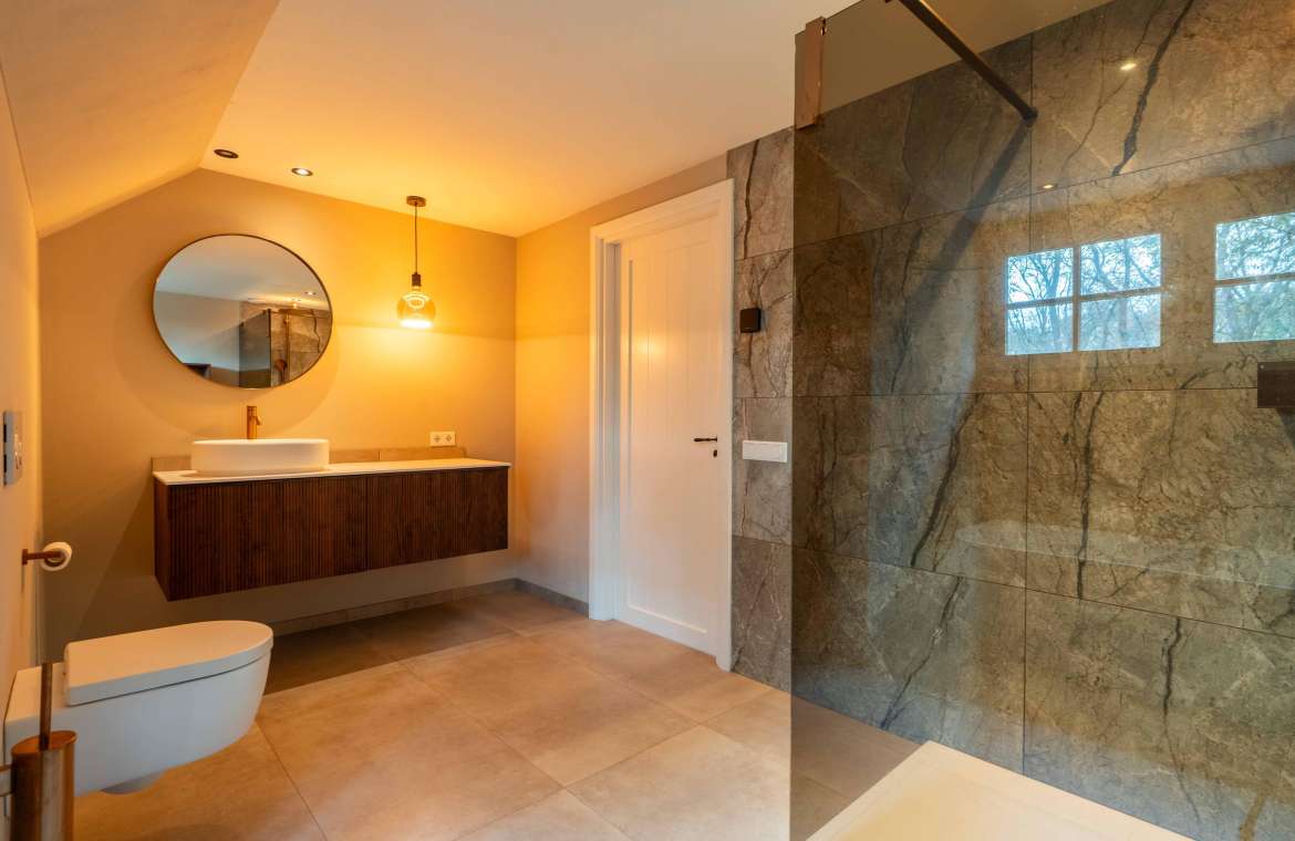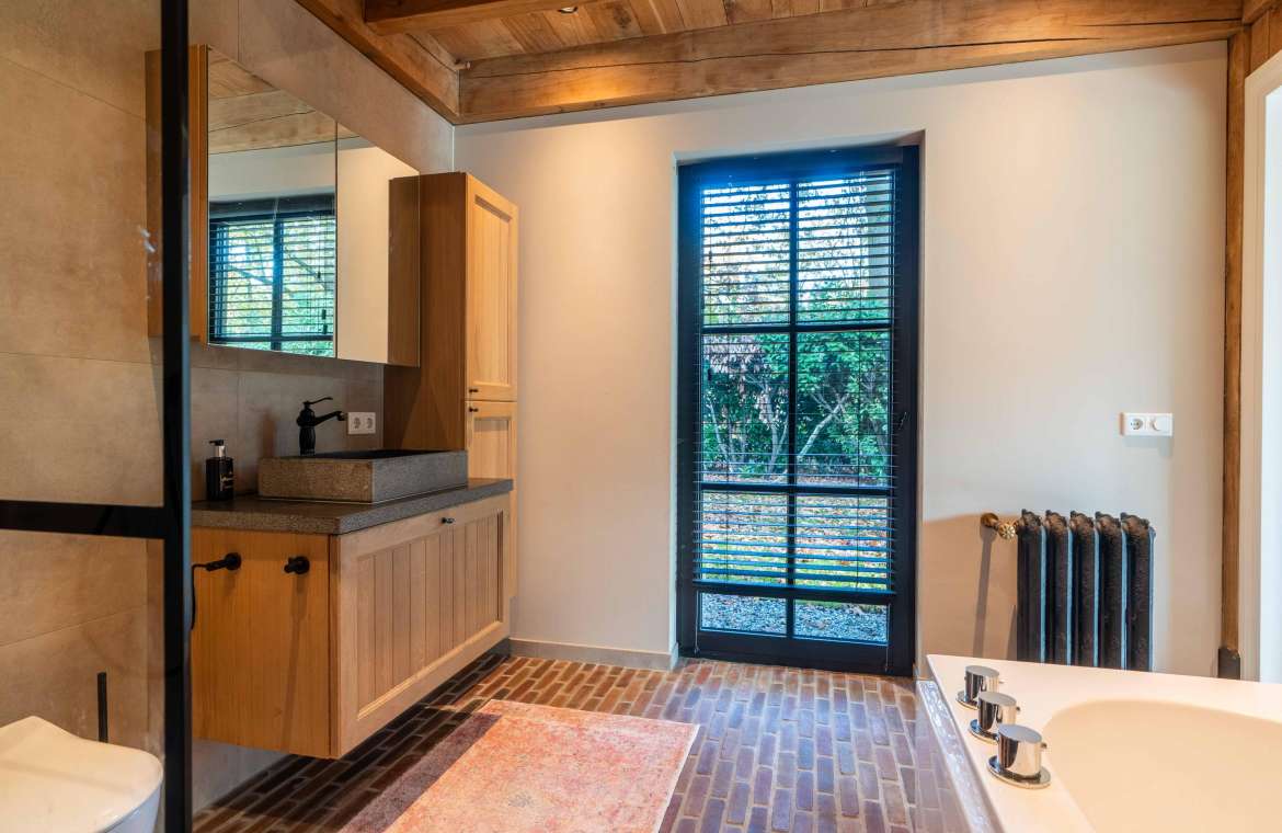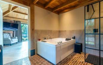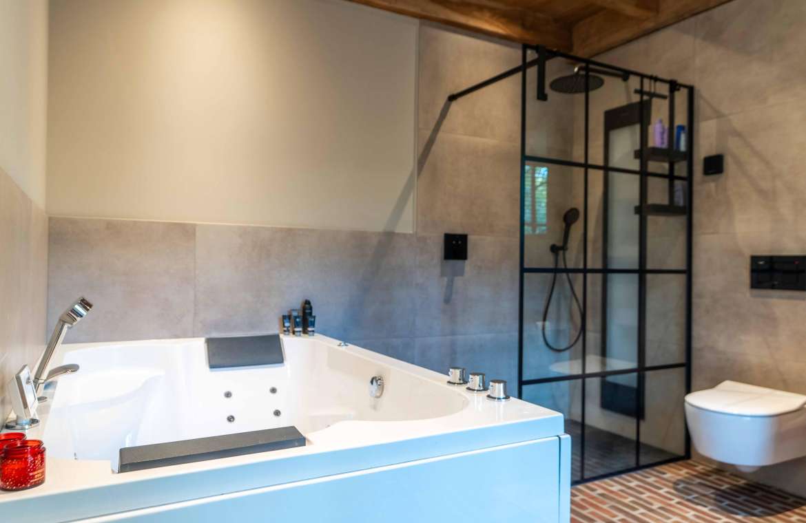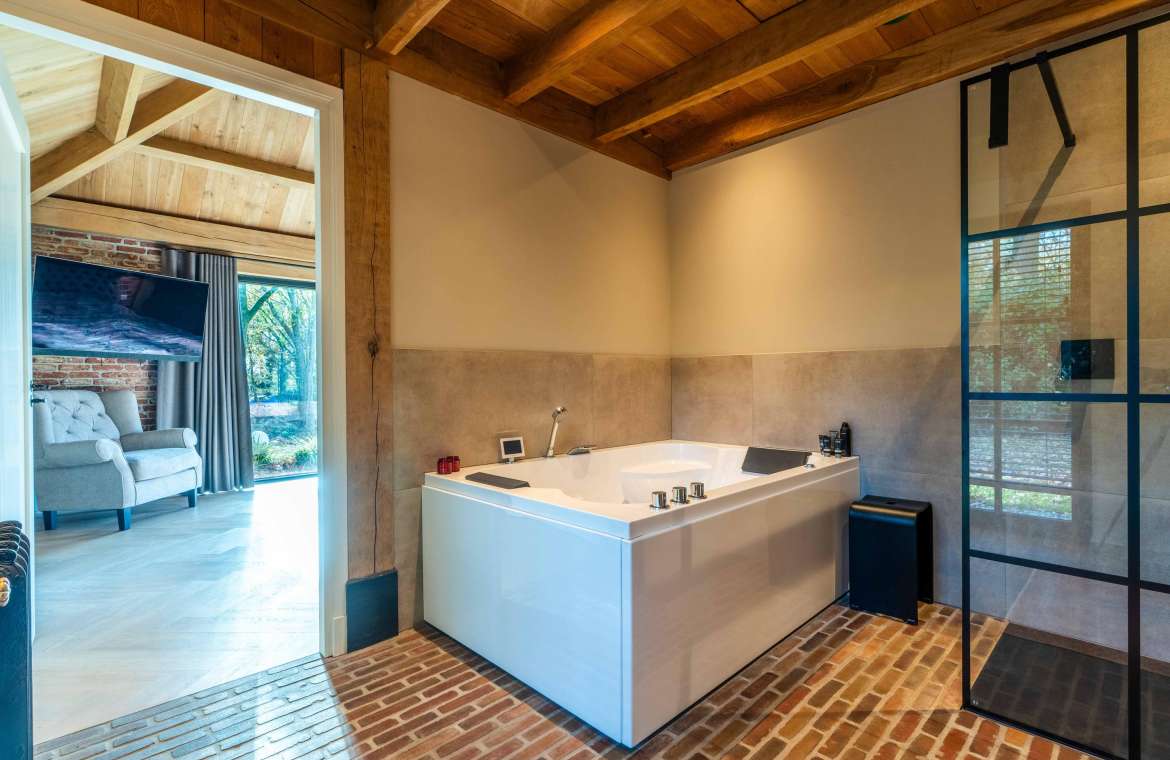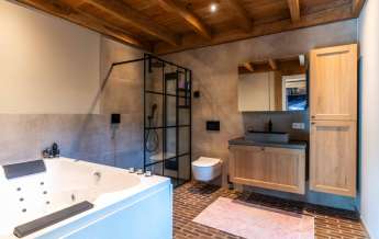 Deze royale, deels betegelde luxe badkamer is voorzien van een tweepersoons whirlpool bad (met verlichting, ingebouwde speakers met bluetooth-verbinding) , eikenhouten badmeubel met hardstenen blad met kom, inloopdouche (met stortdouche en infrarood sunshower) voorzien van inbouwkranen en een wandtoilet. De kranen zijn allen in een zwarte uitvoering. De wanden zijn deels afgewerkt met glad stucwerk en de vloer is ook hier uitgevoerd in gebakken klinkers. Het eikenhouten plafond is voorzien van inbouwspots.