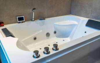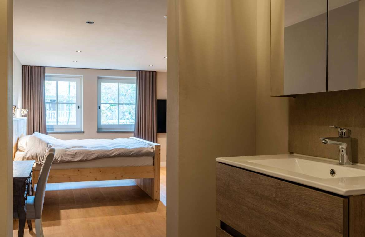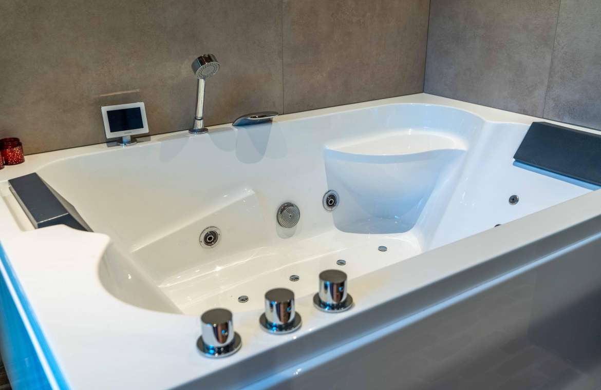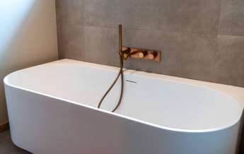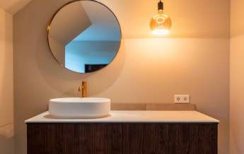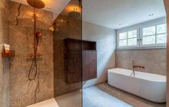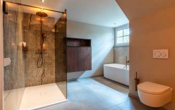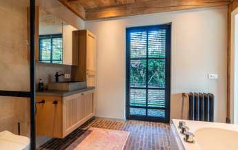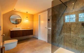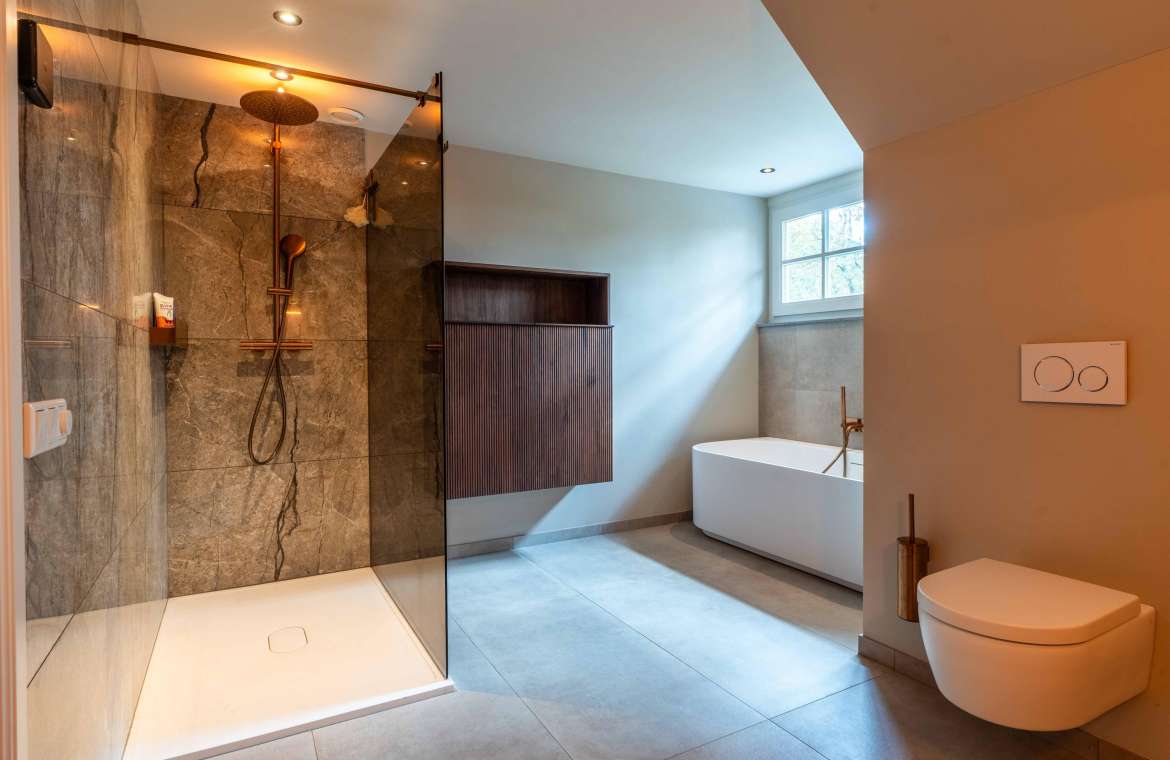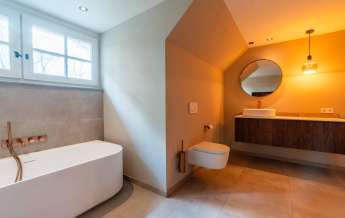 Deze royale, deels betegelde luxe badkamer is voorzien van een tweepersoons whirlpool bad (met verlichting, ingebouwde speakers met bluetooth-verbinding) , eikenhouten badmeubel met hardstenen blad met kom, inloopdouche (met stortdouche en infrarood sunshower) voorzien van inbouwkranen en een wandtoilet. De kranen zijn allen in een zwarte uitvoering. De wanden zijn deels afgewerkt met glad stucwerk en de vloer is ook hier uitgevoerd in gebakken klinkers. Het eikenhouten plafond is voorzien van inbouwspots.