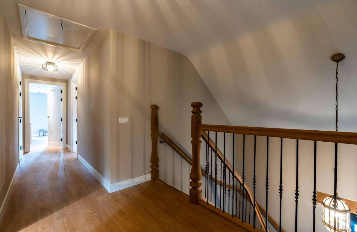 Via de eikenhoutentrap komt u op de verdieping. Deze indrukwekkende, tot in de puntjes mooi afgewerkte open ruimte is voorzien van strak stucwerk, prachtige smeedijzeren balustrades met houten leningen.