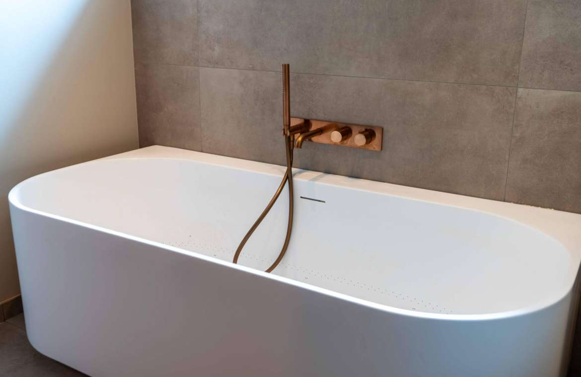 Ook deze royale en prachtige deels betegelde luxe badkamer is voorzien van een whirlpool ligbad met verlichting, badmeubel met wit composiet blad met kom, inloopdouche (met stortdouche) en toilet. De kranen zijn allen uitgevoerd in een rosé-gouden kleur. De wanden zijn verder deels afgewerkt met glad stucwerk. Het plafond is voorzien van inbouwspots. En er is mechanische afzuiging aanwezig.