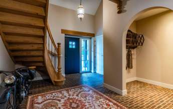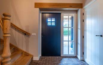 De prachtige sfeervolle entree met grote vide geven een heerlijk ruimtelijk gevoel, contact met de verdieping en een unieke sfeer, door zijn hoge dak, mooie afwerking en gebakken klinkers op de vloer.