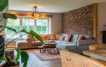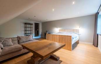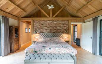 De wanden zijn uitgevoerd in deels stucwerk en deels schoonmetselwerk, wat in combinatie met het eikenhouten dak wederom een streling voor het oog is.