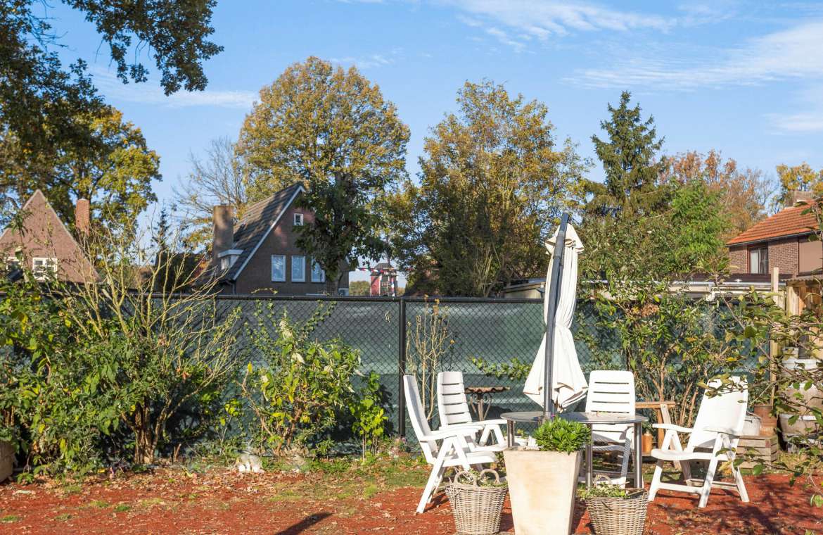 Dit zéér royale kavel heeft natuurlijk een verrassend en zeer grote achtertuin. Dat rondom grotendeels is voorzien van een hekwerk (Elreka). Een gedeelte van de tuin bestaat uit fraaie grote bomen, je hebt hier je eigen bos!