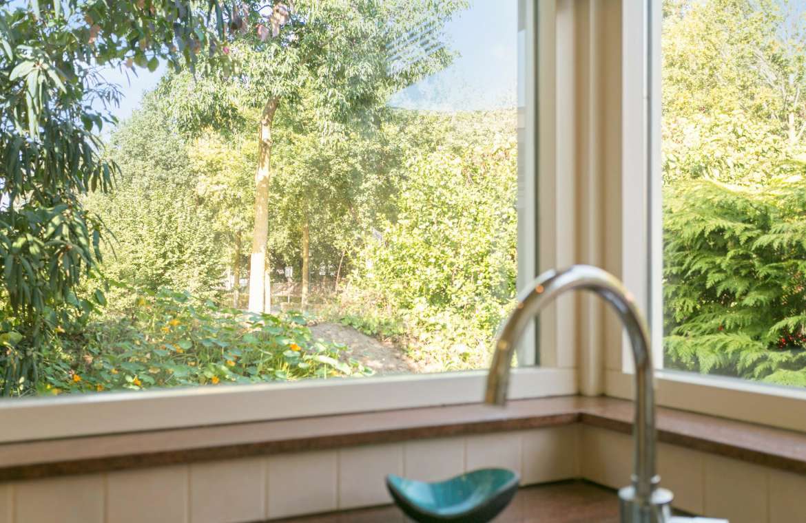 De keuken is geplaatst in een hoekopstelling, uitgevoerd met onder- bovenkasten en lades in een kleur wit. De wand boven het granieten aanrechtblad is deels betegeld. Boven de spoelbak zijn inbouwspots geplaatst. Het raam aan de zijkant is voorzien van een screen. Vanuit hier heeft u uitzicht over de achtertuin.