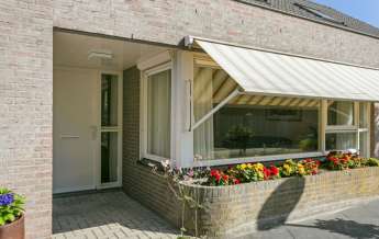 De voor-, en zijtuin zijn beplant met vaste beplanting, sierbestrating met antraciet tegels en een gemetselde plantenbak over de gehele breedte van het raam. Het grote raam aan de voorzijde is voorzien van een zonneluifel. Het zijraam heeft een elektrische screen. De oprit is bestraat. Via een beklinkerd pad voorzien van een metalen poort heeft u toegang tot de vrije achterom.