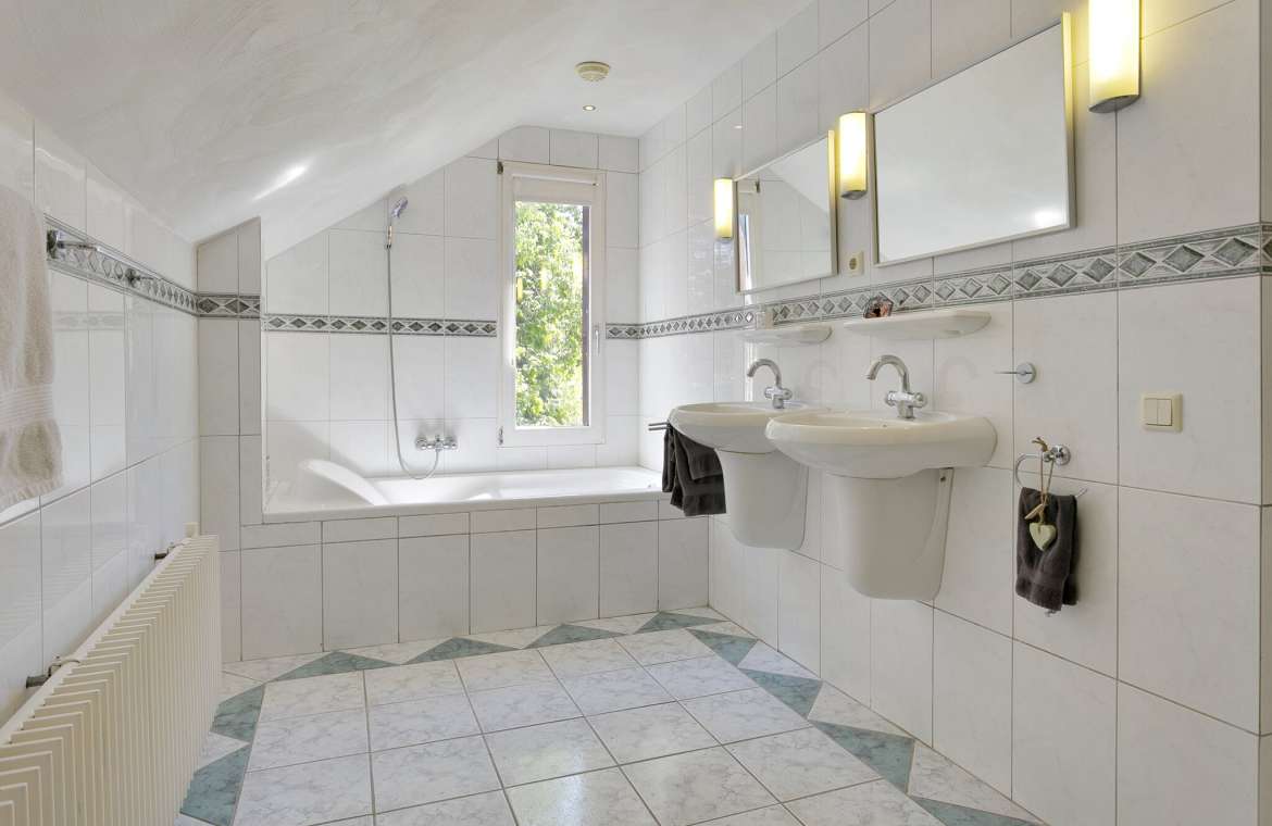 De ruime badkamer is uitgevoerd met een douche, een wandtoilet, twee wastafels en een bad. Het plafond is voorzien van inbouwspots en het raam geeft wat lichtinval en de nodige ventilatie.