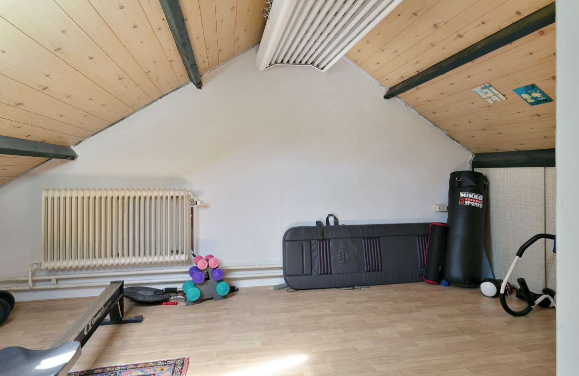 Deze ruimte is voorzien van elektra, verwarming en water. Er is een ruime vliering aanwezig, handig voor de nodige opslag. De garage heeft aan de opritzijde fraaie, houten openslaande garagedeuren.