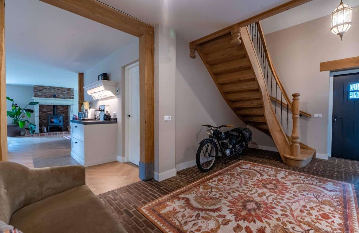 De prachtige eigenhouten trap, de vide, de oude authentieke klinkervloer zorgen voor een ‘warme’ binnenkomst.