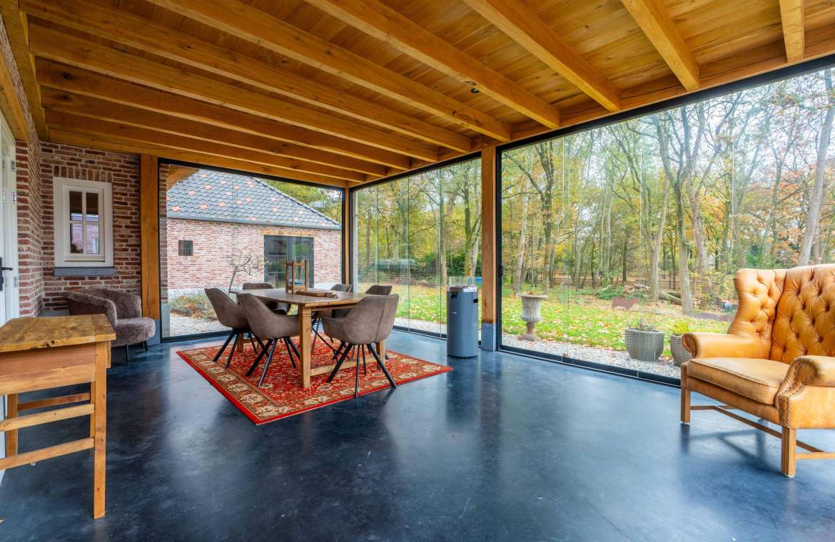 Deze prachtige veranda is ook voorzien van een eikenhouten dakbeschot met balklaag waarop een geïsoleerd dak aanwezig is. Ook is de monolithisch afgewerkte betonvloer geïsoleerd en deze ruime is rondom te sluiten met glazen schuifwanden. Ook hier is TV/internet aansluiting aanwezig.