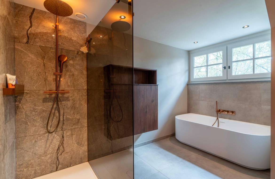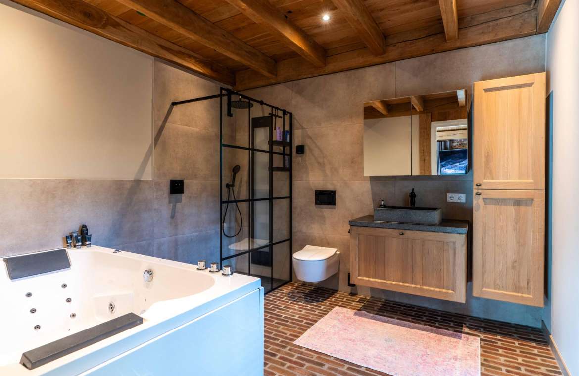 Deze royale, deels betegelde luxe badkamer is voorzien van een tweepersoons whirlpool bad (met verlichting, ingebouwde speakers met bluetooth-verbinding) , eikenhouten badmeubel met hardstenen blad met kom, inloopdouche (met stortdouche en infrarood sunshower) voorzien van inbouwkranen en een wandtoilet. De kranen zijn allen in een zwarte uitvoering. De wanden zijn deels afgewerkt met glad stucwerk en de vloer is ook hier uitgevoerd in gebakken klinkers. Het eikenhouten plafond is voorzien van inbouwspots.