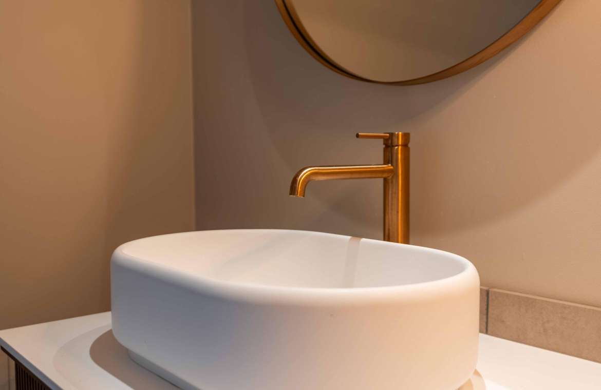 Ook deze royale en prachtige deels betegelde luxe badkamer is voorzien van een whirlpool ligbad met verlichting, badmeubel met wit composiet blad met kom, inloopdouche (met stortdouche) en toilet. De kranen zijn allen uitgevoerd in een rosé-gouden kleur. De wanden zijn verder deels afgewerkt met glad stucwerk. Het plafond is voorzien van inbouwspots. En er is mechanische afzuiging aanwezig.
