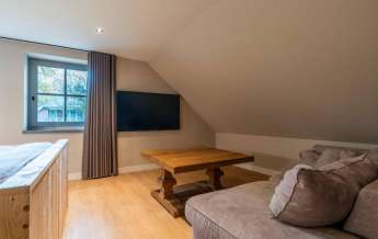 Vanuit de entree komt u in de sfeervolle, luxe en landelijke keuken met koffiecorner. De keuken is van alle gemakken en luxe apparatuur voorzien.