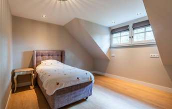 Via de Walk-in closet bereik je deze prachtige slaapkamer. Door de grote raampartijen lijkt deze wel ‘één’ met de tuin. Het hoge dak is tot en met de nok fraai afgewerkt met eikenhouten spanten en betimmeringen. Ook hier kun je middels tuindeuren je bos in lopen.