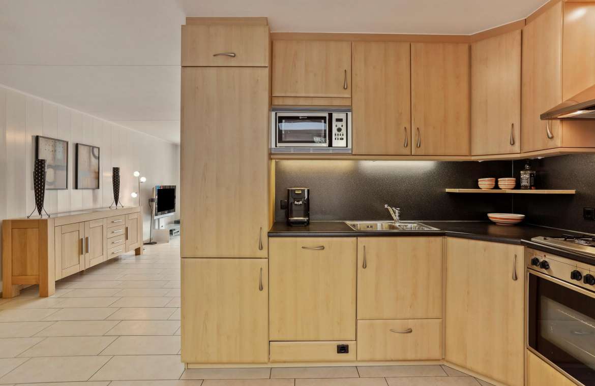 De woonkamer heeft het zitgedeelte aan de voorzijde met aan de achterzijde de open keuken. De wanden zijn deels betimmerd/ spuitwerk.