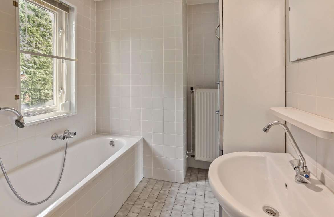 De geheel betegelde badkamer is uitgevoerd met een ligbad, een douche, een toilet, wastafel en badmeubel. Ventileren kunt u d.m.v. het afzuigsysteem. Het raam zorgt voor daglicht en natuurlijke ventilatie.