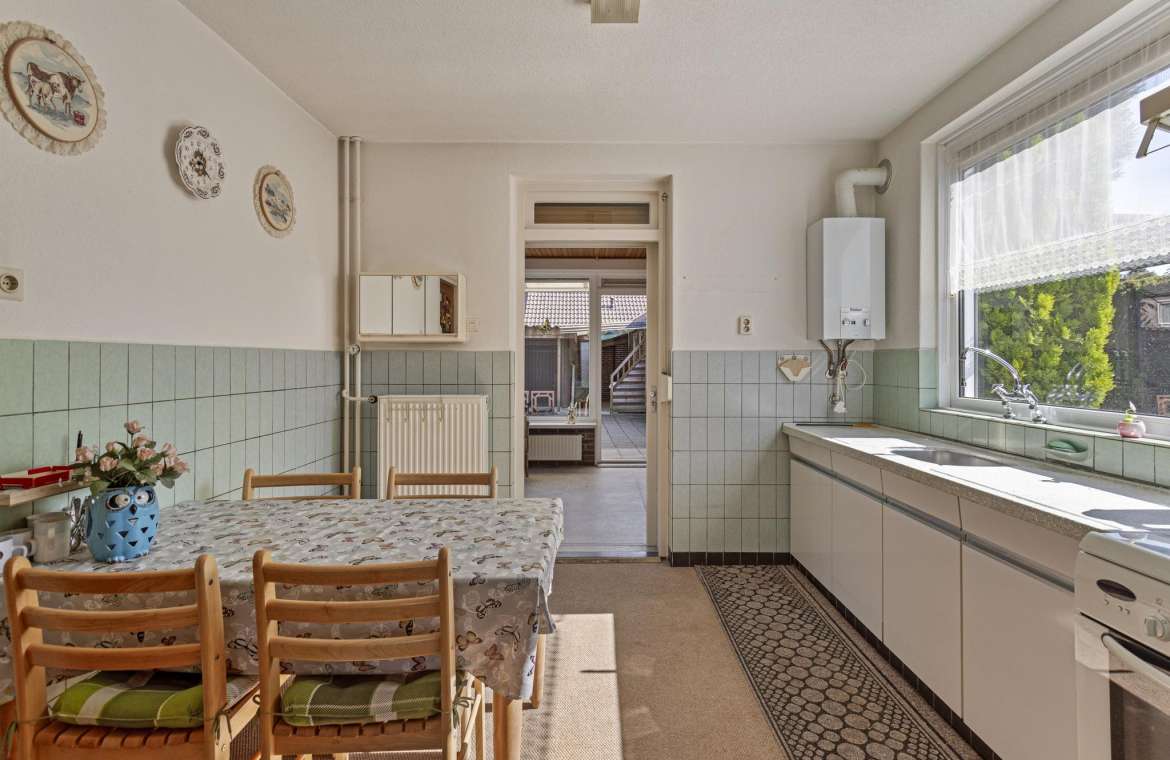 Deze ruimte is voorzien van een aanrechtblok met stenen aanrechtblad en de geiser. In de zijgevel bevindt zich een groot raam. Dat zorgt ook hier voor fijn veel lichtinval. Vanuit hier heeft u toegang tot de verdiepte trapkast, de serre en de woonkamer.