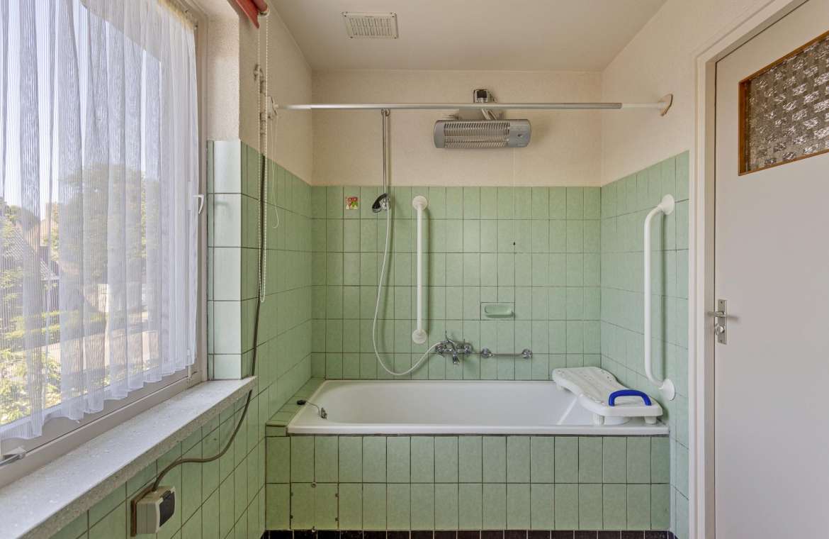De deels betegelde badkamer is voorzien van een bad, een wastafel en een toilet. Boven het tegelwerk zijn de wanden afgewerkt met een structuur afwerking.