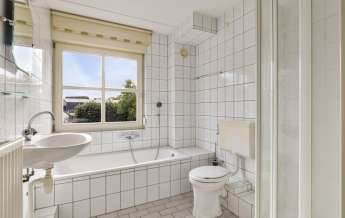 De geheel betegelde badkamer is uitgevoerd met een toilet, een douche met douchecabine, een ligbad, wastafel en radiator.