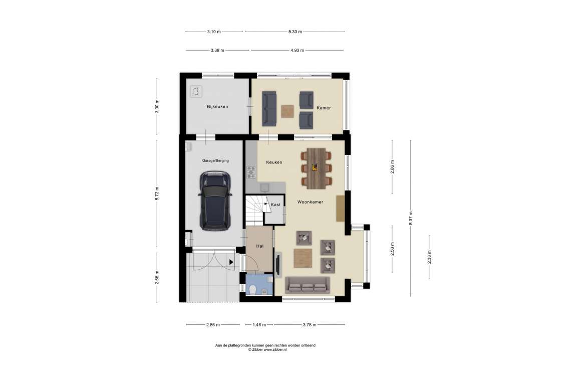 U betreedt de woning aan de voorzijde. Vanuit de hal heeft u toegang tot de woonkamer, het toilet en de inpandige garage/ berging. Via de dichte trap bereikt u de eerste verdieping.