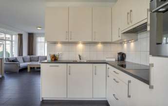 De woonkamer is door de vele lichtinval een fijne ruimte om in te verblijven. Het plafond is afgewerkt met spuitwerk en voorzien van inbouwspots. Een mooie erker zorgt in het zitgedeelte voor een fijn contact met de zijtuin.