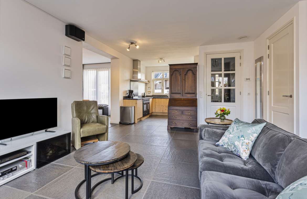 De ruime woonkamer is door de vele lichtinval een fijne ruimte om in te verblijven. De wanden en plafonds zijn voorzien van glad stucwerk en op de vloer ligt een mooie antraciet doorlopende tegelvloer. De keuken is geplaatst in een U-opstelling en ligt aan de voorzijde van de woning. De zitkamer grenst aan de tuinzijde, de vier prachtige openslaande tuindeuren aan de achterzijde geven mooi uitzicht over de tuin.