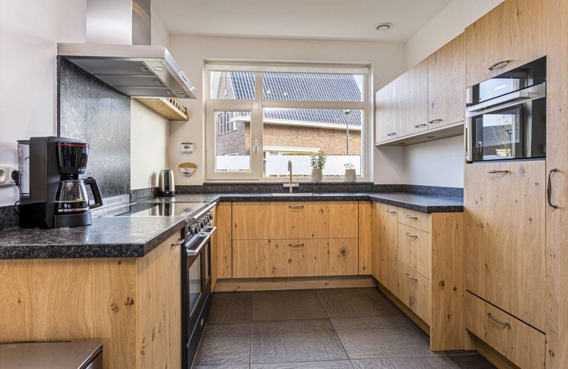 De prachtige keuken is geplaatst in een U-opstelling en is helemaal in balans met de rest van het huis. De keuken is voorzien van een donker granieten blad en mooie deuren en panelen in houtlook, deze zijn ca. 3 jaar geleden allen vernieuwd.