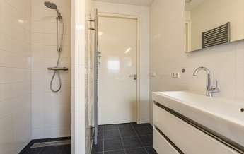 De zeer nette badkamer is speels en doordacht ontworpen. Ventileren kan middels de afzuiging of met het raam in het dakkapel. De frisse witte kleuren geven alles een strakke en mooie uitstraling.