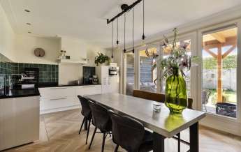 De moderne keukenopstelling met de witte kasten, grote lades en zwart stenen blad is tijdloos. De combinatie van strak en groene handvorm tegels passen perfect bij de klassieke, in visgraat gelegde, vloer.
