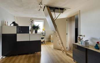 En dan zijn we er nog niet! We hebben in deze woning dus een begane grond, een éérste- en tweede verdieping, maar ook nog een derde! Via een vlizotrap bereik je nog een zolderruimte met een nokhoogte van ca. 2,20m.
