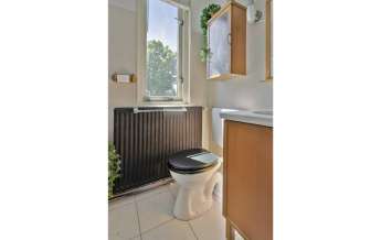 De badkamer is voorzien van een ligbad met douchemogelijkheid, toilet en vaste wastafel.