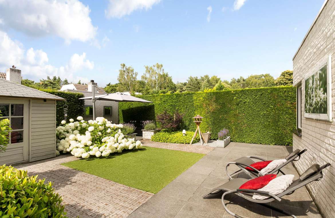 Deze privacy biedende, mooi aangelegde en onderhouden achtertuin is voorzien van kunstgras, twee zitgedeeltes en beplanting zoals Annabelles, en struikjes. Gescheiden door een Taxushaag aan de achterzijde en aan de zijkant voorzien van een houten schutting en een groenblijvende Coniferenhaag.