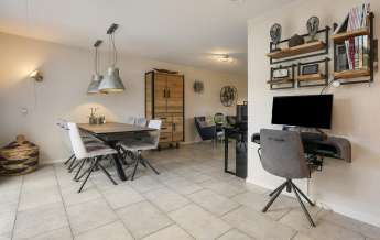 Via een moderne zwarte deur met helder glas komt u in de gezellige huiskamer met aan de voorzijde het zitgedeelte. De twee ramen aan de voorzijde zijn uitgevoerd met elektrisch bedienbare markiezen. Alle drie de ramen zijn voorzien van een elektrisch plisségordijn. De gashaard, afgewerkt in geborsteld staal, geeft een gezellige sfeer.