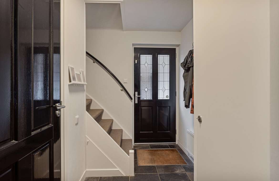 Via de oprit bereikt u de entree. Vanuit de hal heeft u toegang tot de meterkast, het toilet, de woonkamer en de trap naar de verdieping. De wanden zijn voorzien van glad stucwerk. De plafonds zijn afgewerkt met fijn schuurwerk.
