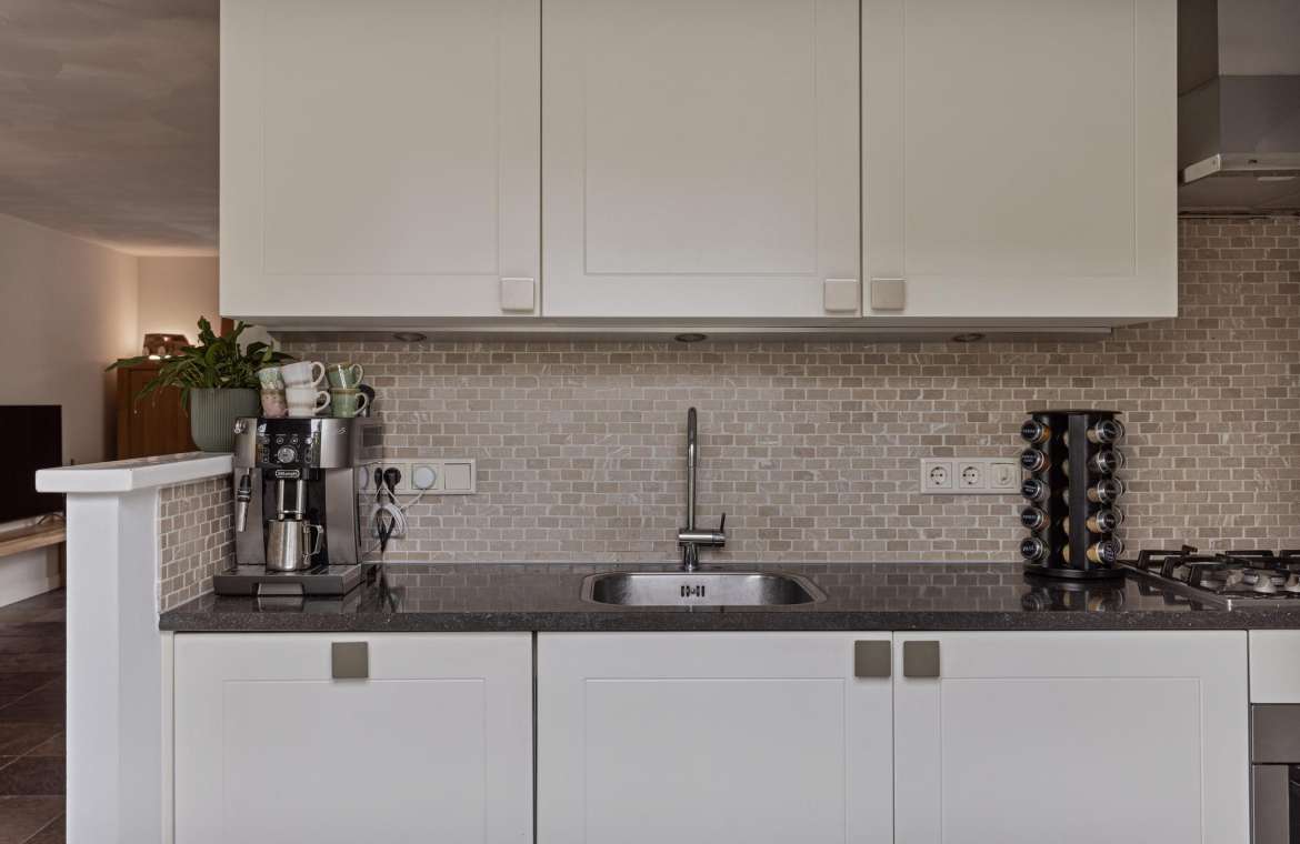De mooie keuken is geplaatst in een rechte opstelling met boven- en onderkasten. De kasten en lades zijn uitgevoerd in een lichte kleur. Het donkere stenen blad en het fraaie tegelwerk maakt een mooi geheel.