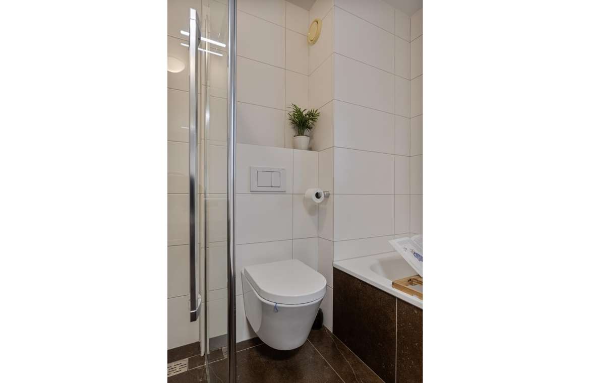 De mooie en geheel betegelde badkamer is voorzien van een inloopdouche, een ligbad, een badmeubel met dubbele wastafel, een wandcloset en een designradiator. In de gevel zit een raam, wat fijn is voor het daglicht en ventilatie, daarnaast is ook mechanische afzuiging aanwezig.