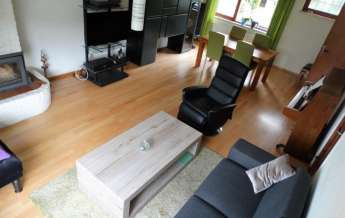 De zithoek is voorzien van een haard. Vanuit de eethoek heb je zicht op de tuin. Aan de tuinzijde ligt ook de keuken.