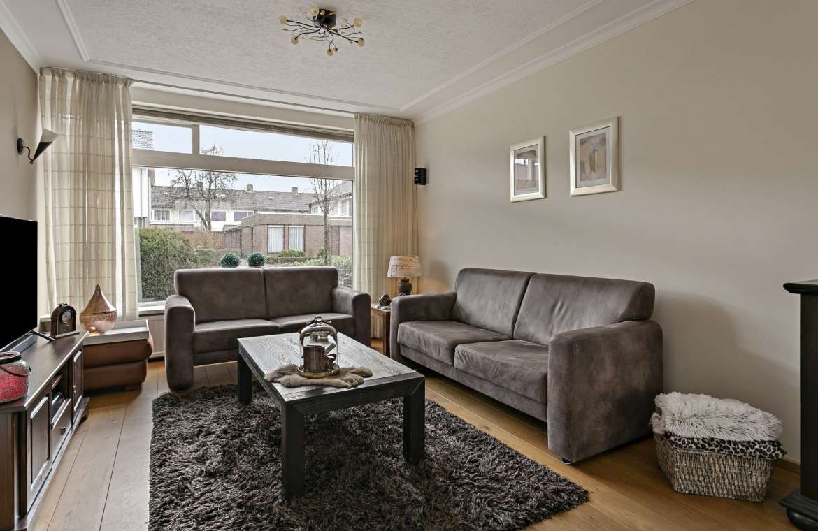 De ruime gezellige woonkamer is voorzien van een mooie massieve houten vloer die zeer goed is onderhouden.