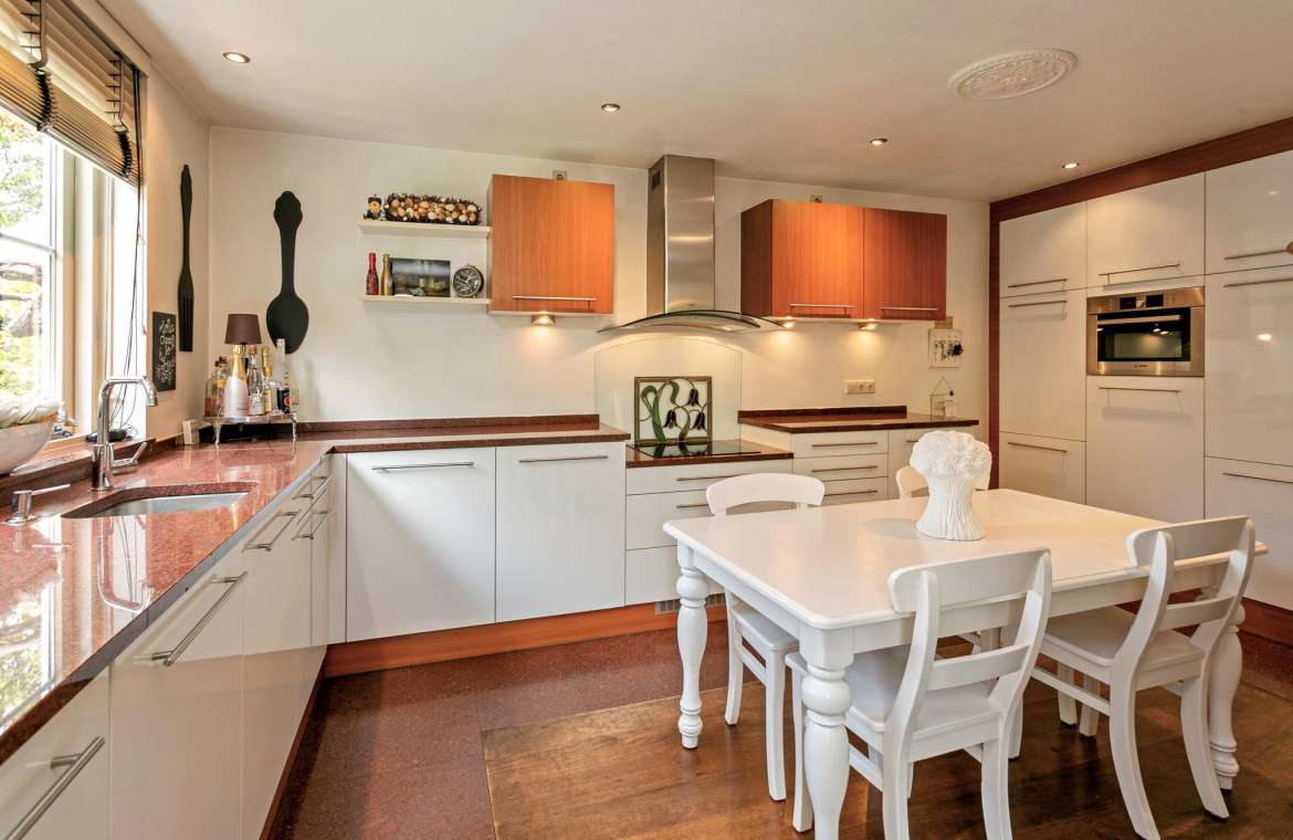 Deze gezellige en royale woonkeuken is een heerlijke plek om te koken en tafelen. De keuken is geplaatst in een hoekopstelling voorzien van boven- onderkasten en lades en een separate kastenwand. Het aanrechtblad, vensterbank en de vloer (deels) is voorzien van een natuursteen die mooi past bij de houten vloer. Het raam zorgt voor fijn contact met de tuin tijdens het koken. De achterdeur is voorzien van een schuifhor en een rolluik.