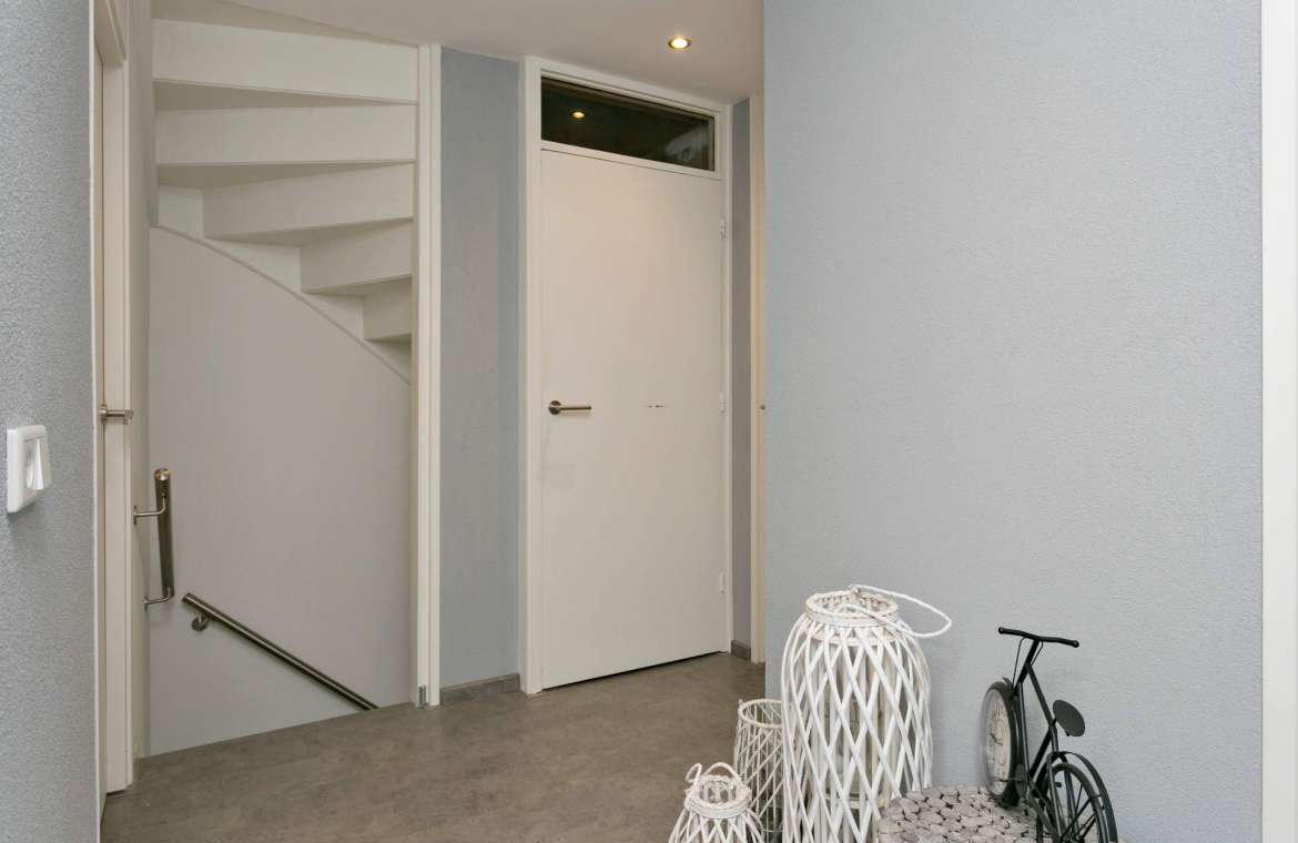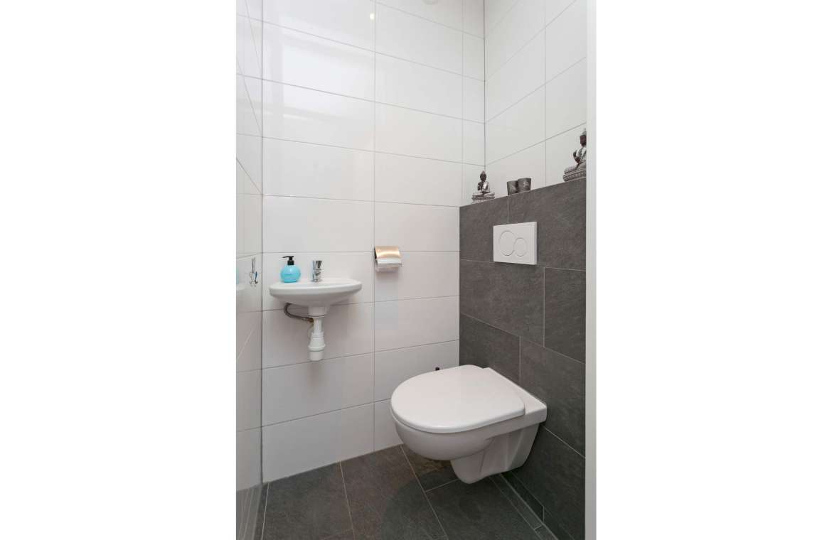 De entree / hal is voorzien van een garderobe, meterkast en toiletruimte met hangcloset en fonteintje.