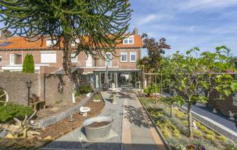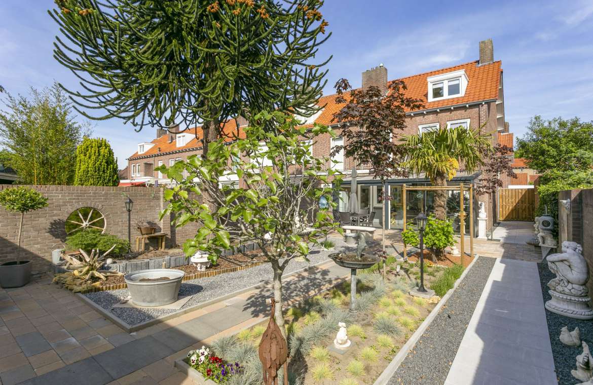 De ruim opgezette zonnige geheel opnieuw ingerichte achtertuin met poort aan voorzijde langs het huis en achterpoort.