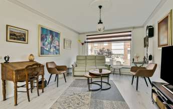 De gestuukte woonkamer met veel lichtinval is voorzien van een schuifpui naar de zomer-winter serre en raam aan voorzijde voorzien van rolluik.
